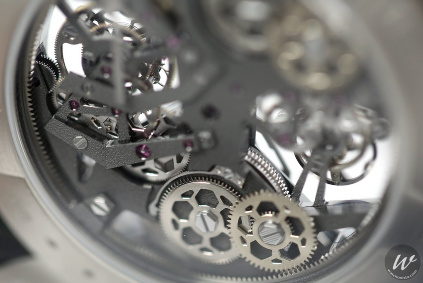 L’architecture globale de cette construction insérée dans une boîte en platine d’un diamètre de 47.40 mm, mise sur le relief et les différents niveaux de cadrans.