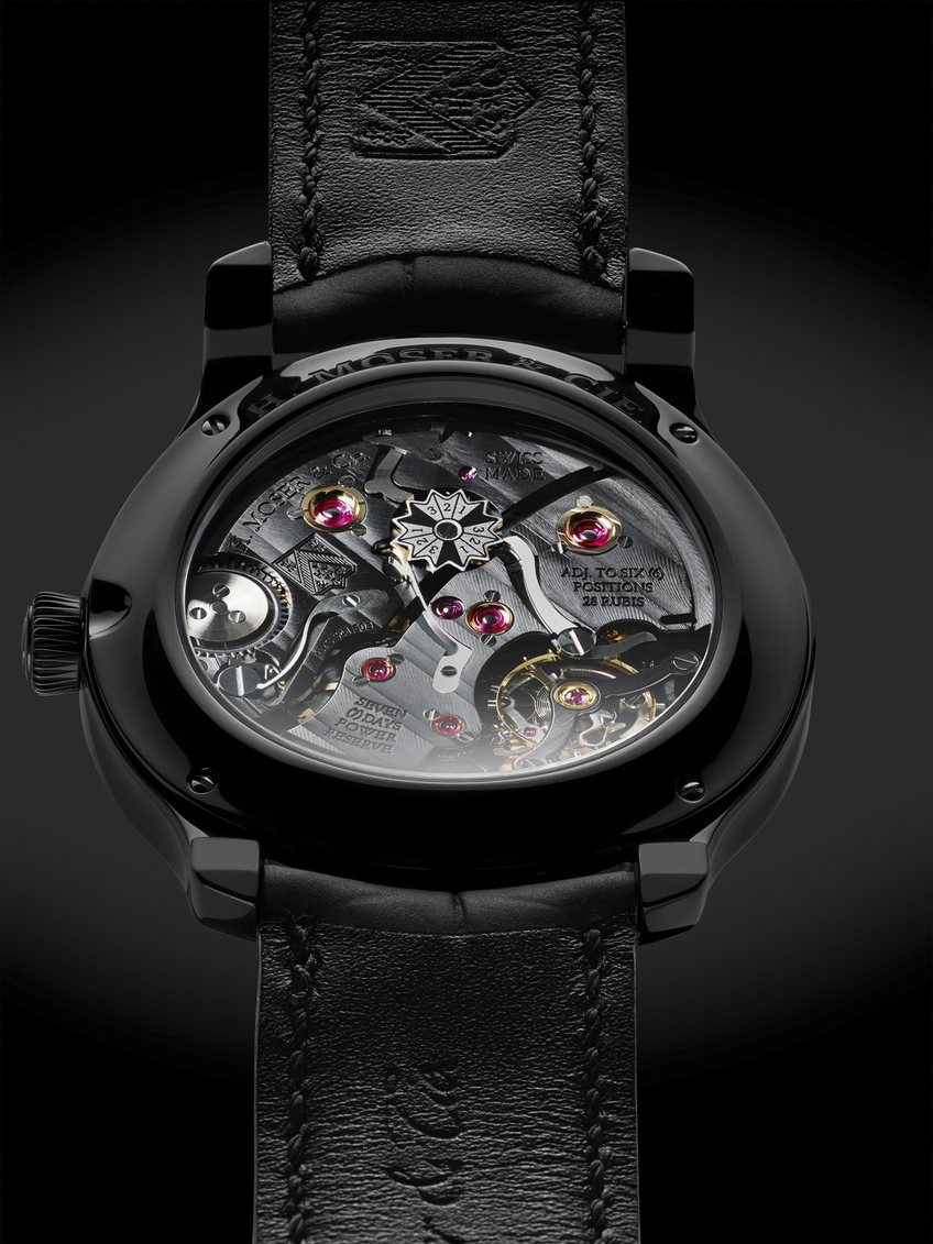 Les subtils reflets polis de la Perpetual Calendar Black Edition laissent augurer du matériau utilisé : le boîtier et la boucle ardillon sont en titane traité DLC. Même le « M » de Moser en relief finement gravé sur la couronne est parfaitement poli. Les aiguilles et les index dorés contrastent avec surface noire du cadran et accentuent tant le caractère intemporel de la montre que sa lisibilité. Le cadran excentré des secondes révèle d'impeccables accents en or alors que le stop seconde permet un réglage précis de l'heure. La finition noire mate du mouvement inclut un pont d'échappement noirci qui met en valeur l’éclat de l’échappement Moser. Cet esprit est également décliné dans la finition mate extrême du bracelet en alligator revêtu de carbone. Grâce à l'attention rigoureuse qu'apportent les ingénieurs et horlogers H. Moser aux détails, la tradition initiée par Heinrich Moser en 1828 se perpétue avec une vigueur renouvelée.