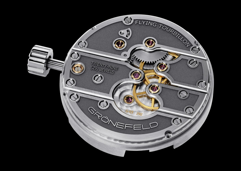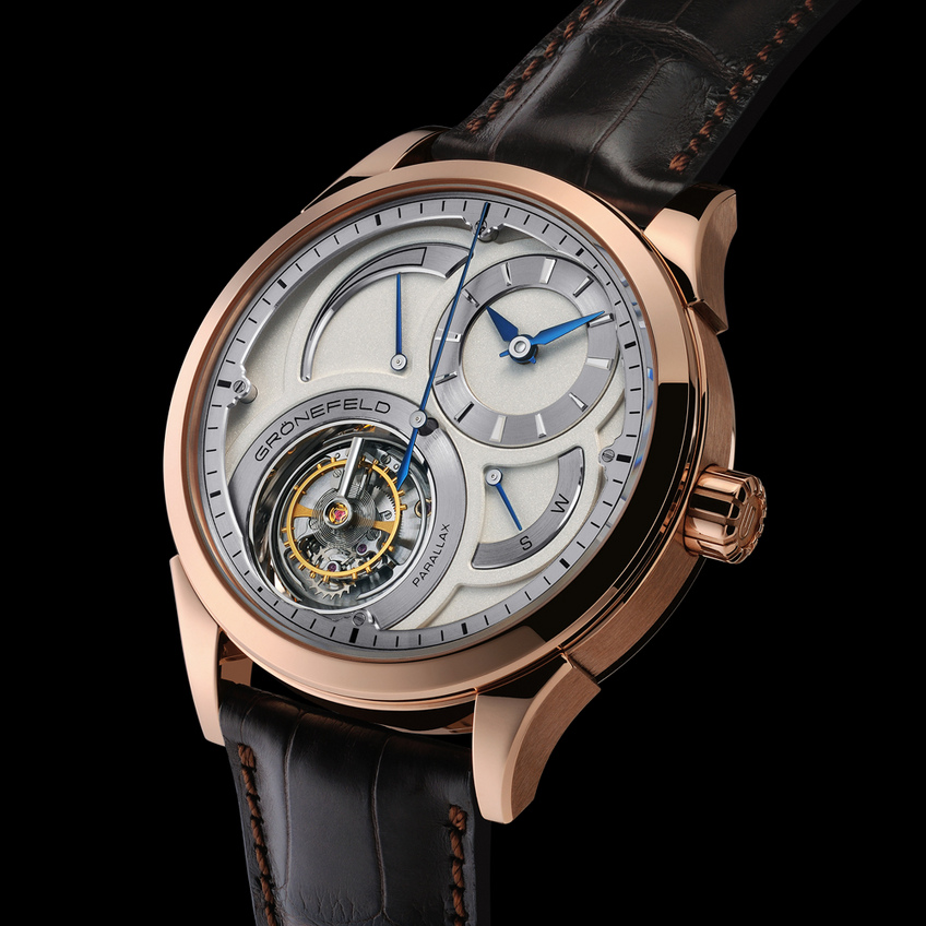 The Grönefeld Parallax Tourbillon features a "flying" tourbillon with a large central seconds hand, stop seconds, a power reserve- and winding-setting mechanism indicator. The in-house movement displays sophistication and craftsmanship at the very highest level.