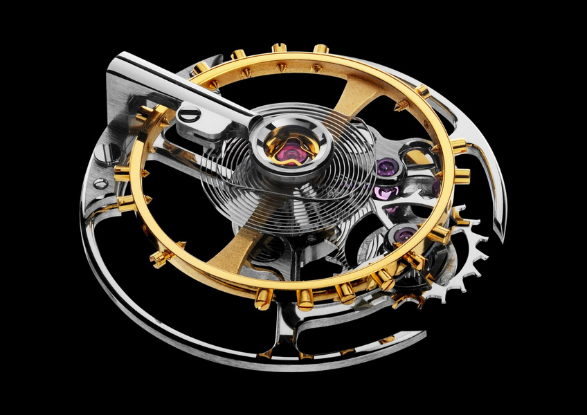 The name "Parallax" is derived from the precision of the readability of the central seconds hand. Parallax is defined as the apparent change in position of an object when the observer changes his own position. To minimize the possibility of error due to parallax when viewing the seconds hand from an angle, the hand is exceptionally close to the outer chapter ring with the seconds indexes. In a neat addition, the one-armed balance wheel bridge always runs parallel to the central seconds hand.The tourbillon cage of the Parallax Tourbillon
