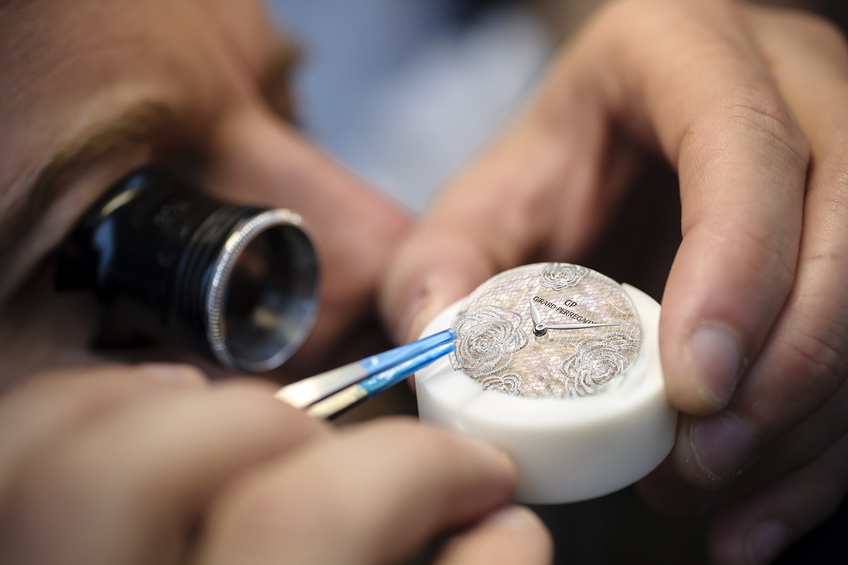The peonies of the Cat's Eye Bloom watch seem to bloom forth from its dial. Fine and fragile, they appear in the form of lace that is overlaid onto a hand-polished beige or natural white (depending on the model) mother-of-pearl dial. To accomplish this, the Manufacture Girard-Perregaux developed a new way of using a well-known method. Each embroidery-like design consists of seven layers of material that are successively applied to create volume and the desired three-dimensional effect. Depending on the model, the second-to-last layer is also given either a gold or silver powder coating to create a shiny effect. Comparable to three-dimensional printing, this process showcases the spirit of discovery that is unique to Girard-Perregaux. The reference to lace is also seen in the "net motif" style background that covers the entire dial case-back.