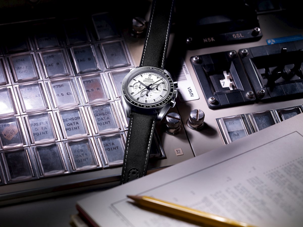 A closer look at the timepiece shows that Snoopy, the beloved dog from the Peanuts cartoon and a NASA mascot, decorates the dial and the caseback – a small tribute to the Silver Snoopy Award that OMEGA was presented with in 1970 in recognition of its contributions to the entire Apollo programme.